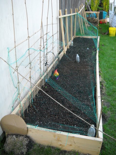 The entire 3x16 bed is covered by the net (with net to spare!). If this doesn't keep those feathered fiends out, then I might just give up!